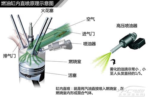 而缸内直喷是直接将燃油喷射在缸内,在气缸内直接与空气混合。ECU可以根据吸入的空气量精确地控制燃油和喷射量和喷射时间,高压的燃油喷射系统可以是使油气的雾化和混合效率更加优异,使符合理论空燃比的混合气体燃烧更加充分,从而降低油耗,提高发动机的动力性能。