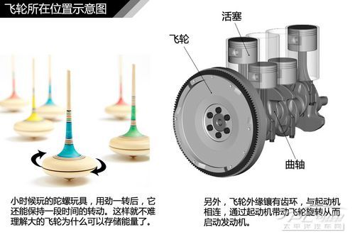 飞轮之所以做得比较大,主要是为了存储发动机的运动能量,这样才能保证曲轴平稳的运转。其实这个原理跟我们小时候的陀螺玩具差不多,我们用力旋转后,它能保持相当长时间的转动。