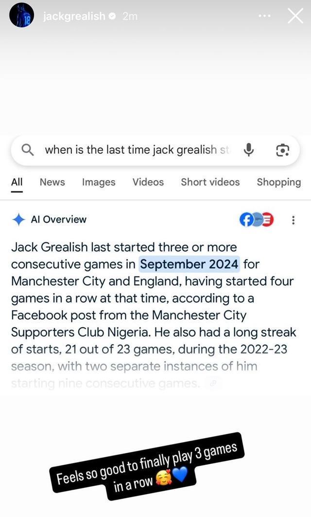 格拉利什在社交媒体上晒出了一张截图,内容是他搜索“格拉利什上一次连续参加三场比赛是什么时候”,并标记了其中AI的回答“2024年9月”。